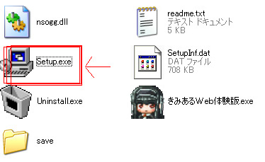 またSetUP.exeを起動しなくても、下図の一番下に ある「save」という名前のフォルダを自分で作成すれば 「きみあるWeb体験版.exe」を起動するだけでゲームができます