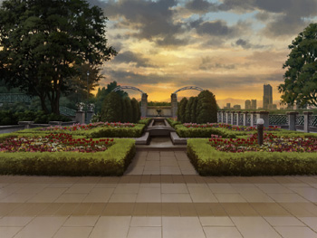 夕暮れの中庭。夜は七浜のビル群がライトアップして夜景が綺麗。