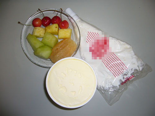 バニラアイスの上に生クリームを乗せフルーツを